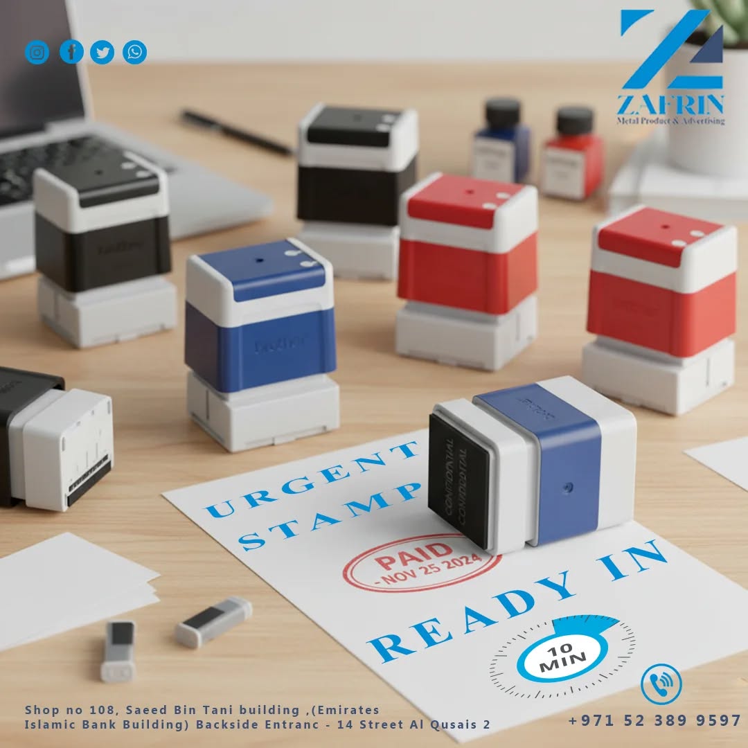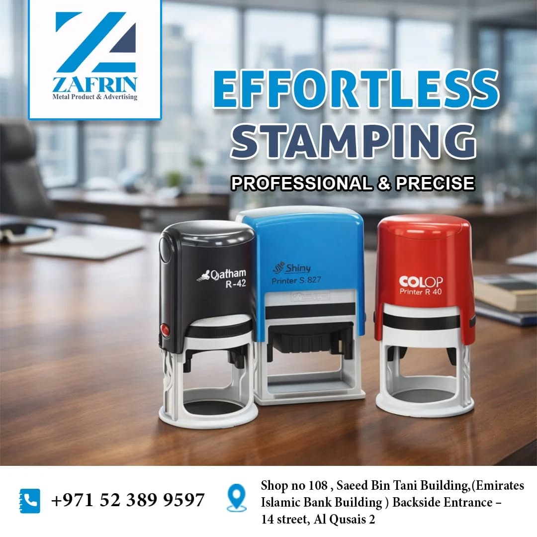 Welcome to Zafrin Stamp Metal Product & Advertising, a leading provider of professional stamp-making solutions, creative advertising services, and high-quality branding products. Based in the UAE, we are committed to delivering precision, creativity, and reliable service to businesses of all sizes.